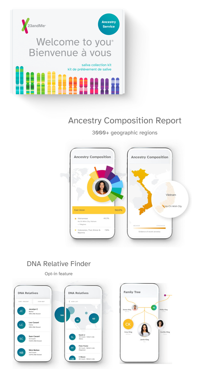 - Relaciones genéticas: posibilidad de encontrar y contactar con parientes genéticos si también se han hecho la prueba (personas que comparten ADN contigo).